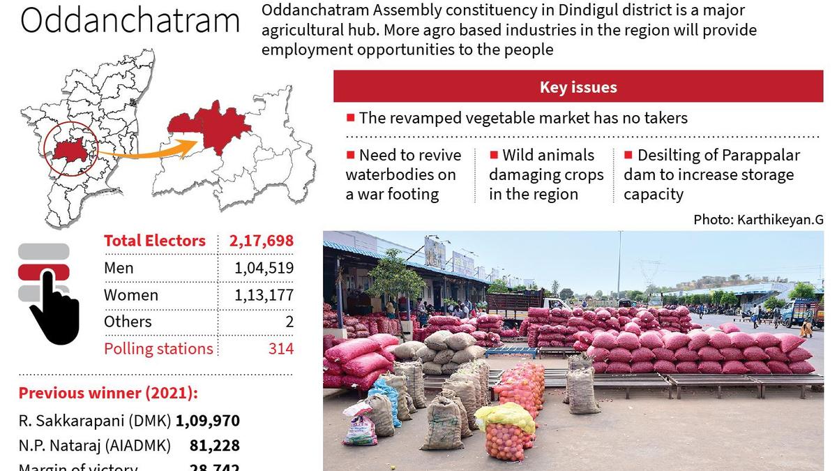 Oddanchatram Assembly constituency in Dindigul district, a DMK stronghold for three decades, requires agro-based industries for development. Senior DMK leader R. Sakkarapani won six consecutive elections from 1996 to 2021. The region seeks industrial expansion aligned with agricultural strengths.