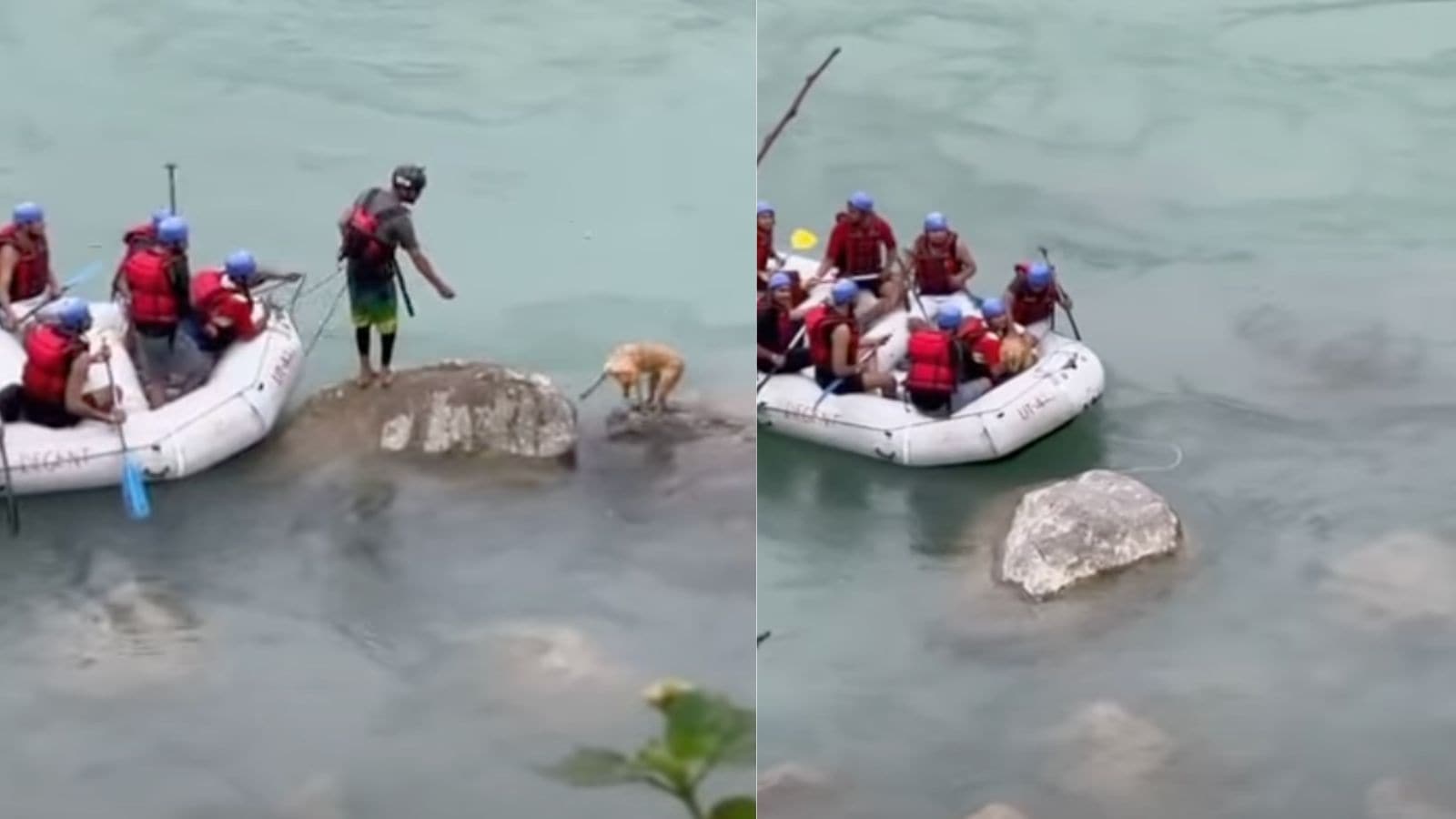 Rafters in Rishikesh, Uttarakhand rescued a dog trapped on a rock in the Ganga River after water levels rose suddenly. One rescuer used a rope to pull the raft closer, then lifted the frightened dog to safety. The viral video received widespread praise on social media for the group's courage and compassion during the dangerous rescue operation.